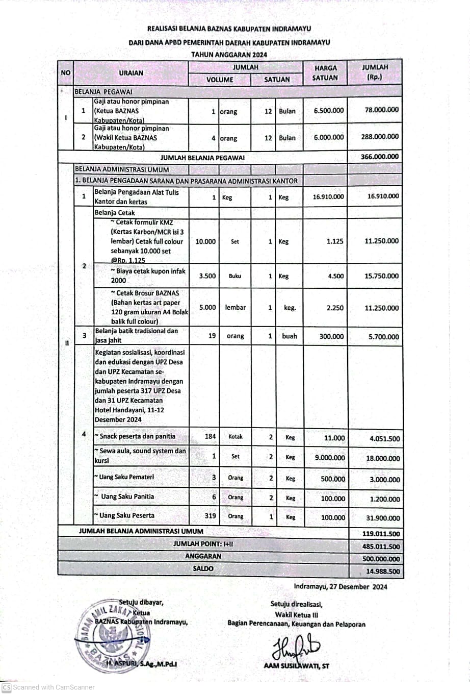 Berdasarkan laporan anggaran yang diterima LSM, total belanja tercatat sebesar Rp485.011.500 dari pagu anggaran Rp500.000.000. Rincian belanja tersebut mencakup belanja pegawai, alat tulis kantor, biaya cetak formulir dan brosur, hingga kegiatan sosialisasi dan pelatihan. Sementara itu, sisa anggaran tahun 2024 sebesar Rp14.988.500 disebut akan digunakan kembali untuk pembelian komputer dan alat tulis lainnya.