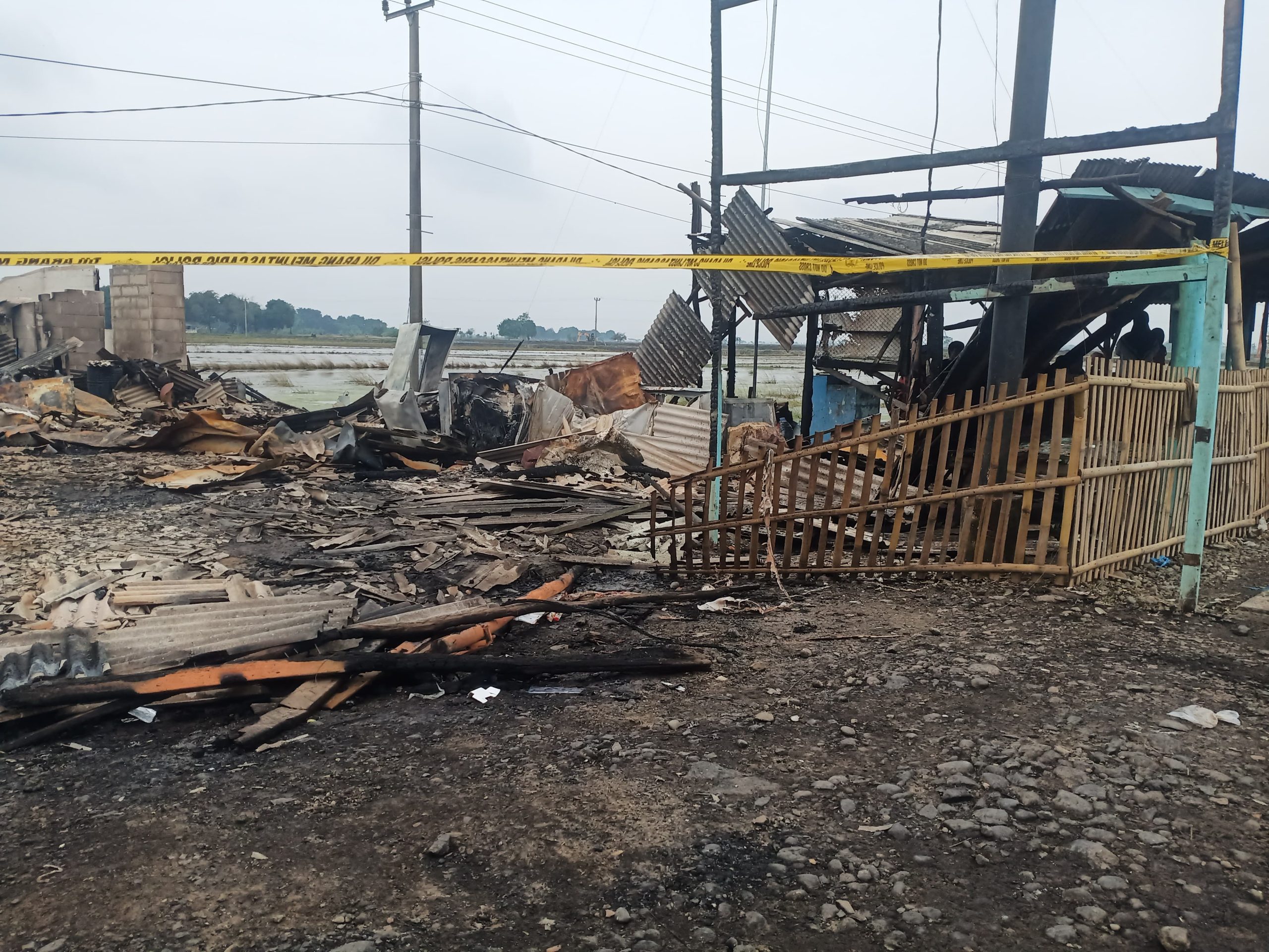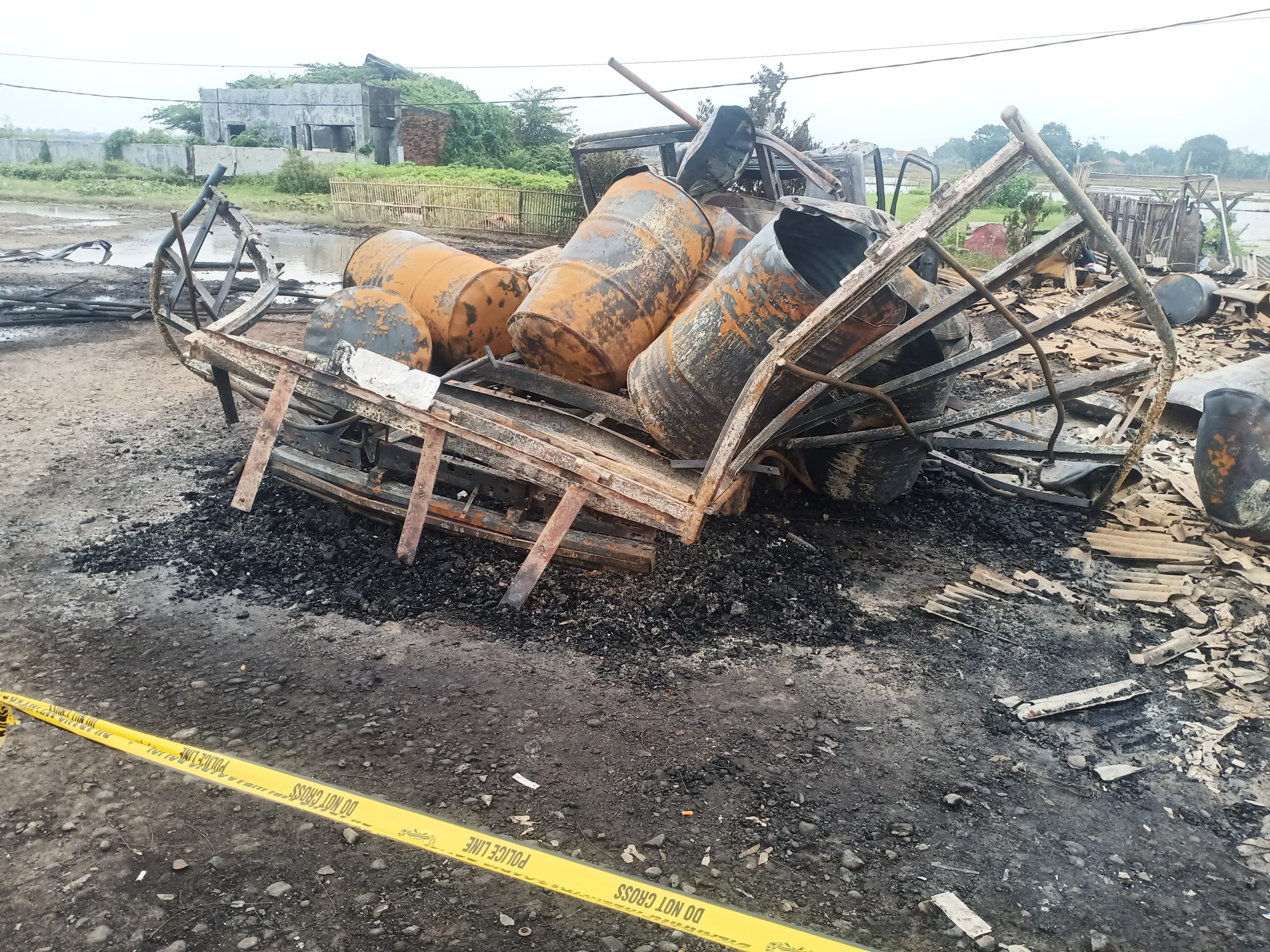 Pemandangan pasca kebakaran benar-benar mengerikan. Truk yang sebelumnya utuh kini hanya menyisakan rangka besi yang hangus, sementara bangunan warung makan di dekatnya luluh lantak dan rata dengan tanah. Puluhan drum yang berserakan di lokasi pun ikut terbakar, menyisakan jejak kehancuran yang membuat warga sekitar syok.